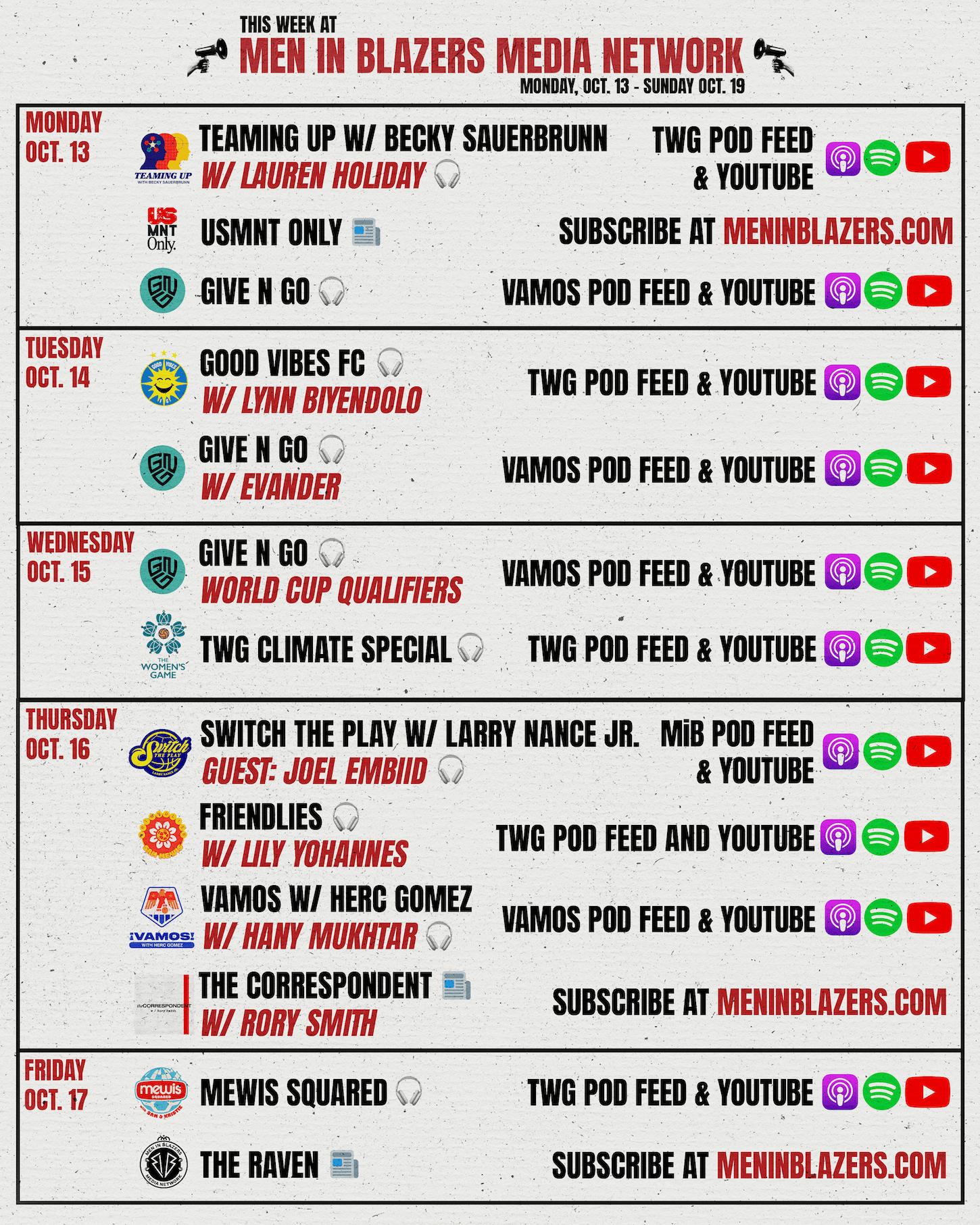 In line with all this soccer, TWG has all these podcasts! Yesterday, Becky Sauerbrunn released an all new Teaming Up with Lauren Holiday and today, Lynn and I are dropping Good Vibes. Tomorrow, we have a special with Professor Radley Horton from Columbia University where I get to ask him all about the impact climate change is having on sports. Thursday, weāve got Friendlies with Lily Yohannes and Friday is an all new Mewis Squared! When we first started The Womenās Game, we were thrilled to put out two episodes a week. Thanks to you all, now we are able and excited to put out five!