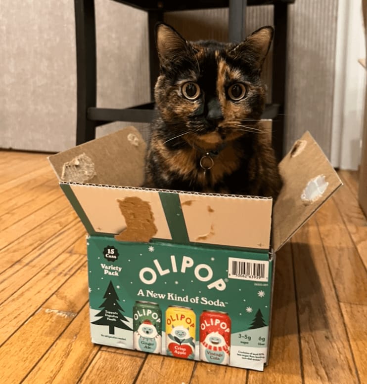 Anyway, I'm reaching out because I thought you should know that after many, many Olipop segments on the pod, I finally bought my first can of Olipop in early November and LOVED it. I bought a Christmas box from Costco recently and my cat, Ivy, is also a big fan.